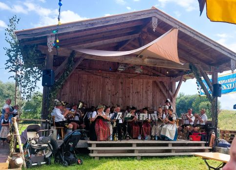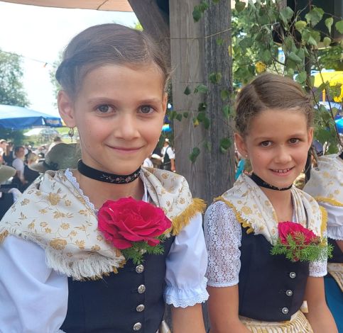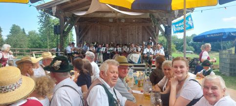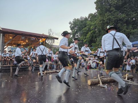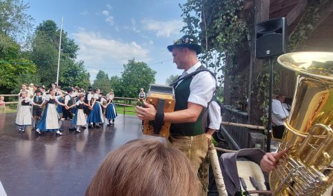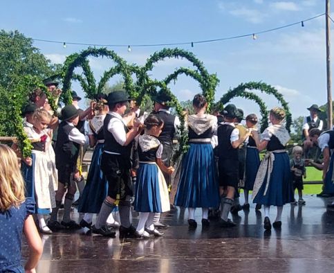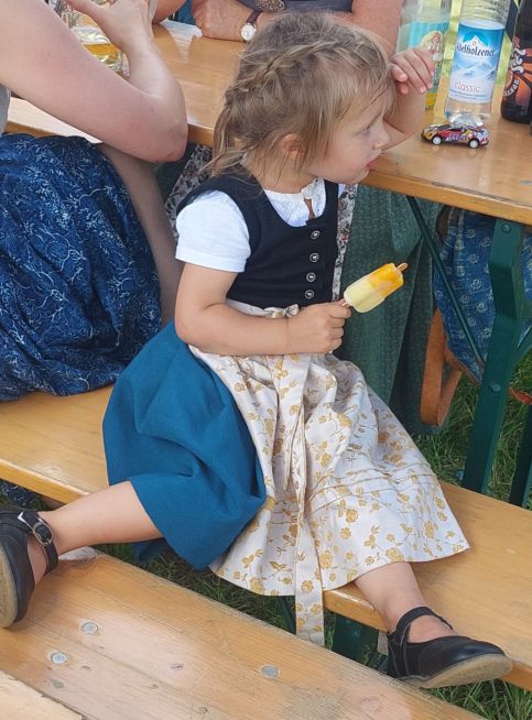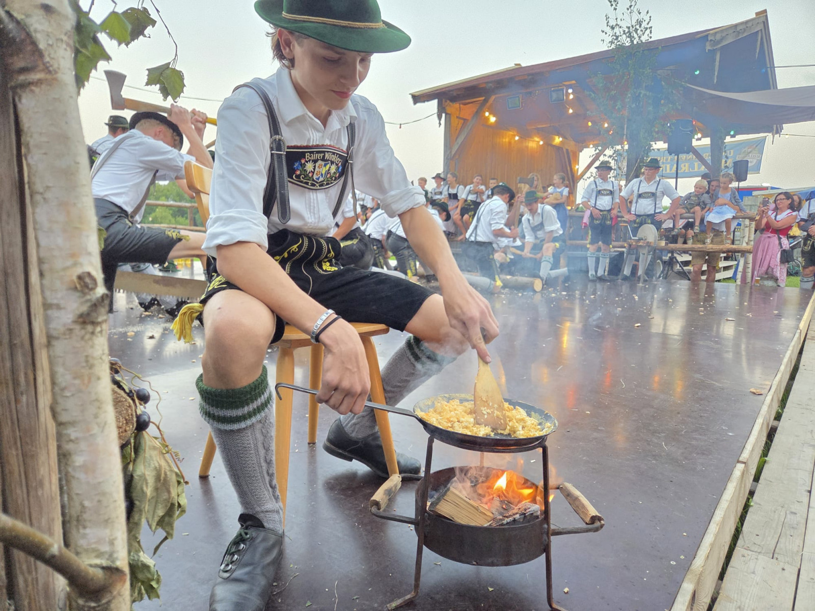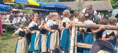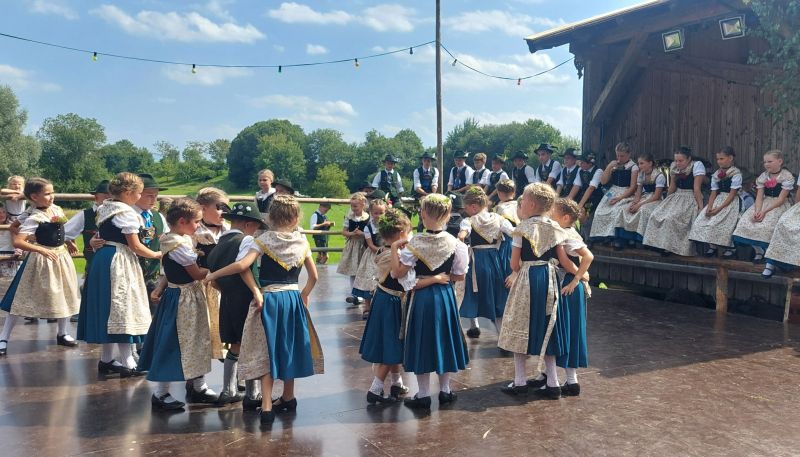 Am Sonntag kamen viele Besucher schon zu Mittag und ließen sich nicht von der hohen Temeratur einschüchtern. Sie genossen dann auch noch den Kaffee oder Eiskaffee mit einer großen Auswahl an frisch gebackenen Schmalznudeln und Torten. Für Kurzweil sorgte die Bairer Musi, ein Losestand, ein Schießstand sowie die Naturkegelbahn.Auch ein Brunnen war mittig auf dem Festplatz aufgestellt worden. So sah man immer wieder Mädels und Buam, die sich dort erfrischten. Zwischendurch zeigten die Kinder, Jugendlichen und auch die jungen Aktiven des Vereins Tänze und Plattler. Die Tanzfläche war auch so ständig mit tanzenden und spielenden Kindern belagert.